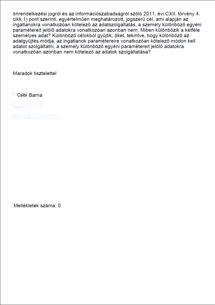Közérdekű adatigénylésemben kifejezetten arra voltam kíváncsi, hogy miért kötelező az ingatlanokra vonatkozó adatokat kiszolgáltatni, viszont nem kötelező a személyre vonatkozó adatokat kiszolgáltatni, a kétféle adatgyűjtési eljárás két különböző célt sejtet, jeleztem levelemben.