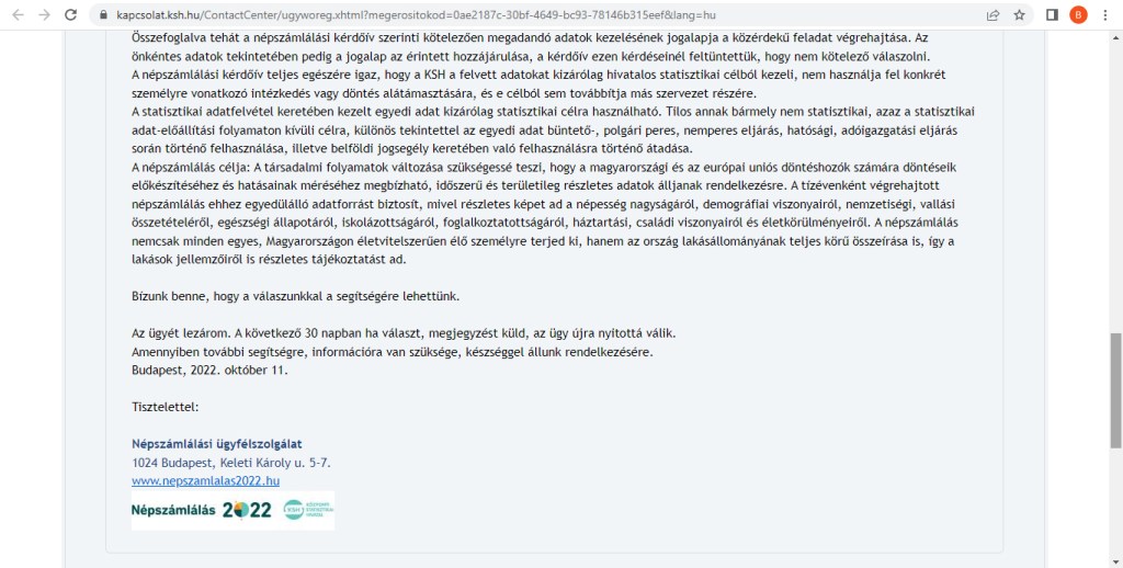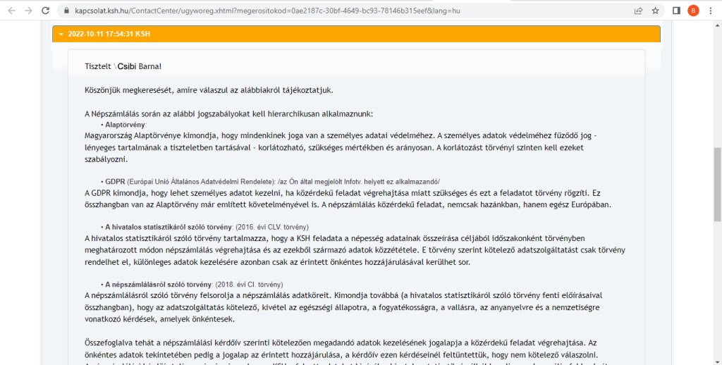 A KSH válaszában arról tájékoztatott, hogy a népszámlálás vonatkozásában nem az infotv.-t kell figyelembe venni, hanem az Európai Unió Általános Adatvédelmi Rendeletét. Azt, hogy miért kellene egy magyar törvény helyett egy európai uniós rendeletet figyelembe venni, mióta léptek az európai uniós rendeletek a jogszabályi hierarchiában a magyar törvények helyébe, a KSH nem tájékoztatott.